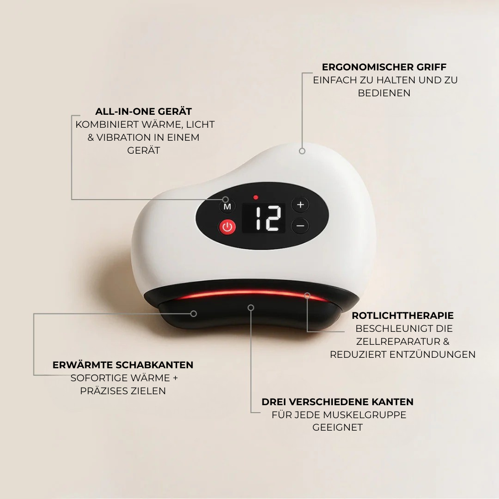 - Vibration – gezielte Mikro-Vibrationen lockern verspannte Faszien und Muskeln, ohne schmerzhaften Druck.